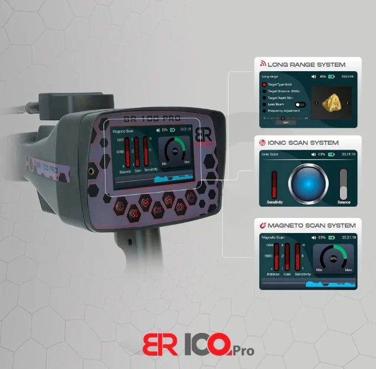 BR 100 Pro supports working with 3 actual detection systems specialized in detecting Gold, Treasures and Precious Metals underground. These systems have been updated and developed over many years so that we now have an accurate and integrated scientific device that can deliver you to your targets in a short time.