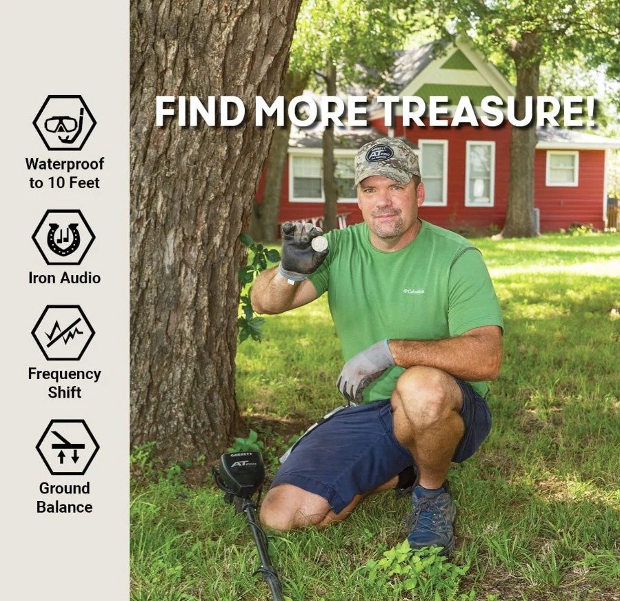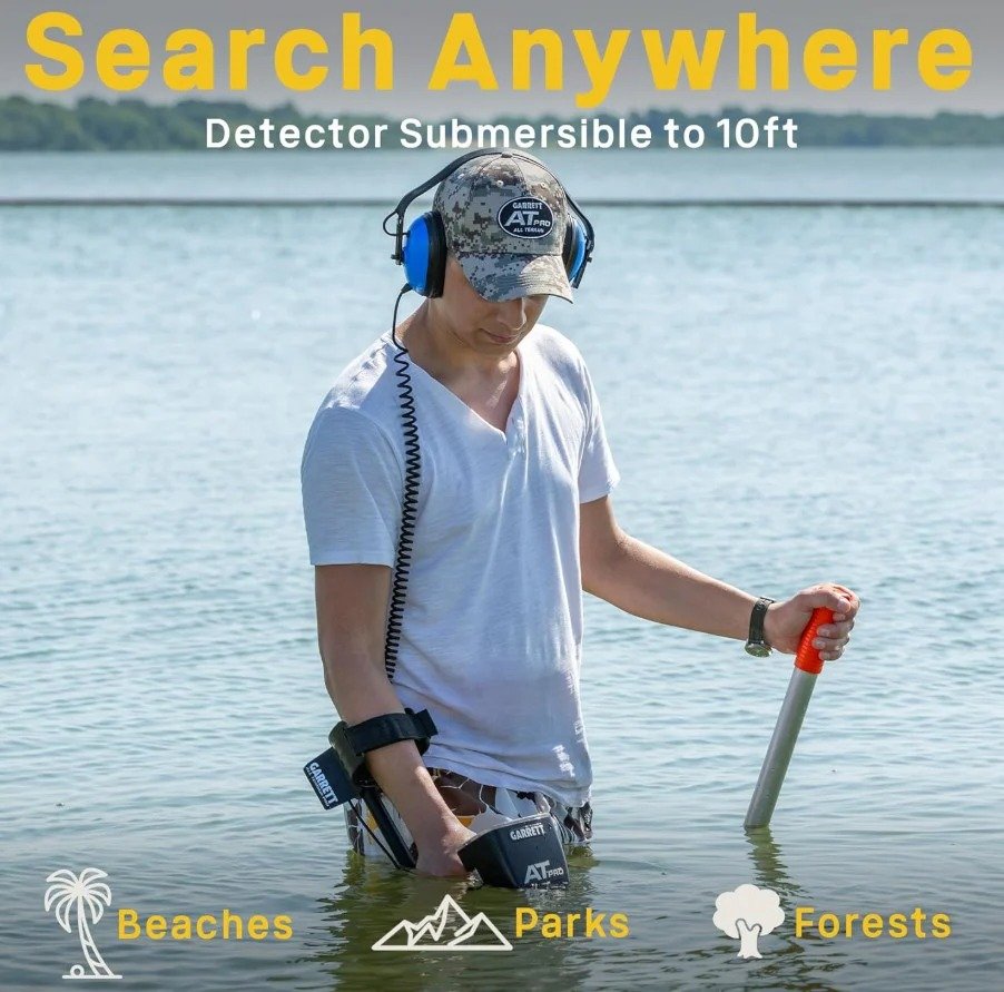 The Garrett AT Pro is a submersible metal detector ideal for the professional treasure hunter seeking versatility across all terrains. With a submersible depth of up to 10 feet, the AT PRO excels in various environments, including on-land and underwater treasure hunting. This detector’s robust design and waterproof construction allow treasure hunters to explore and uncover hidden relics in local lakes, saltwater beaches, and freshwater areas.