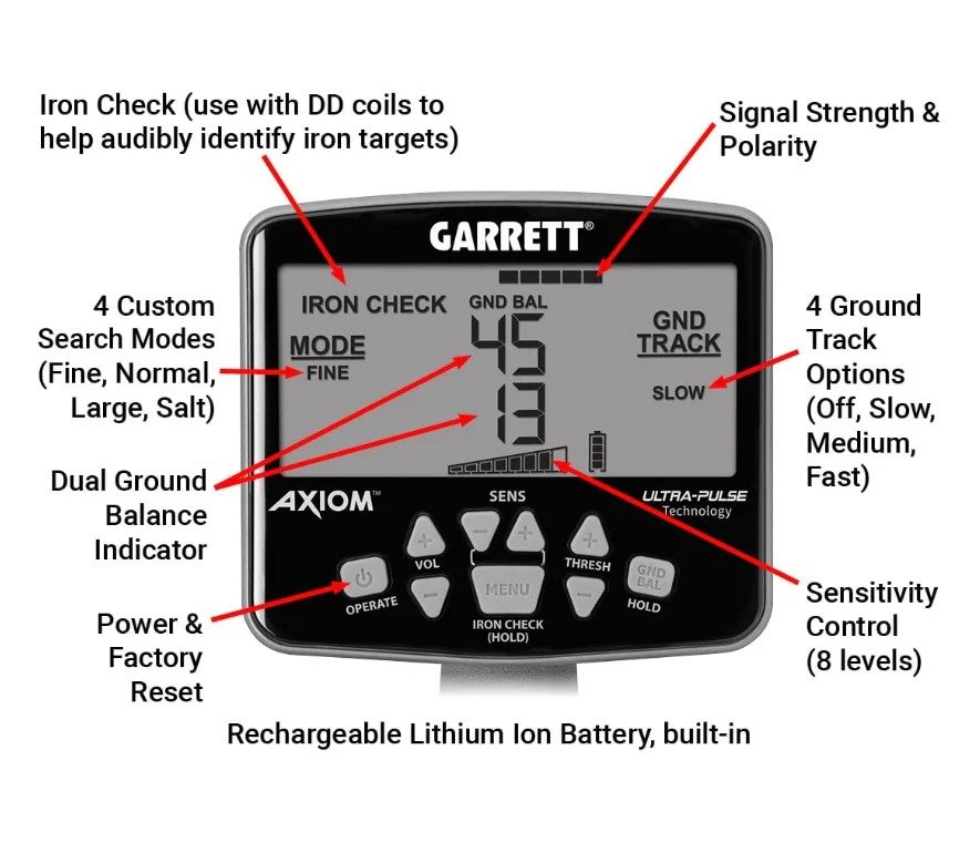 The Axiom pulse induction detector has advanced features that cater to the diverse needs of gold prospectors and treasure hunters: