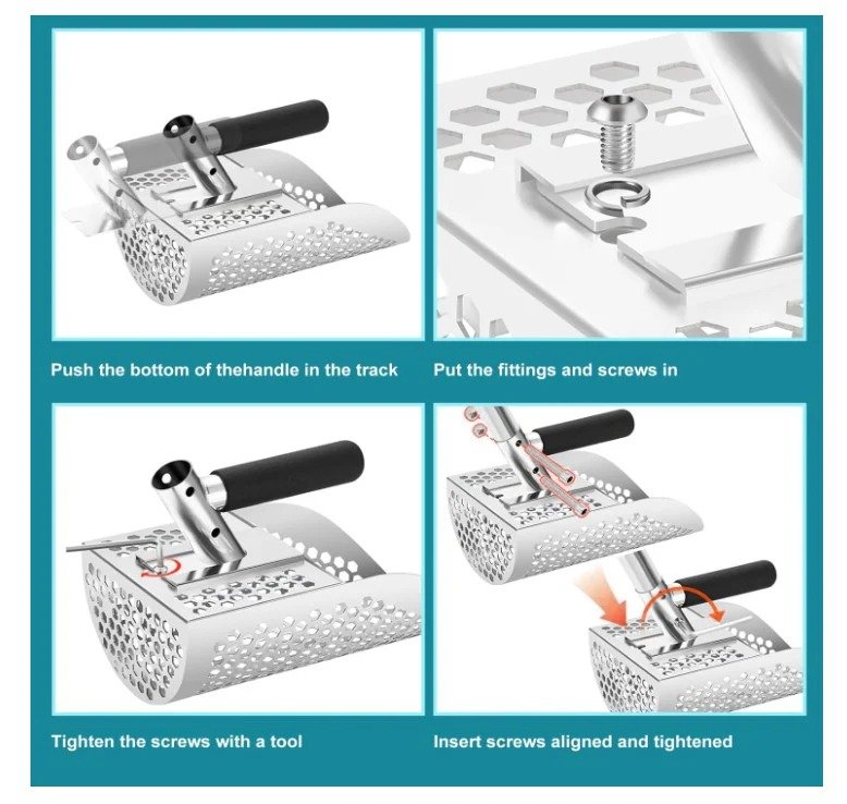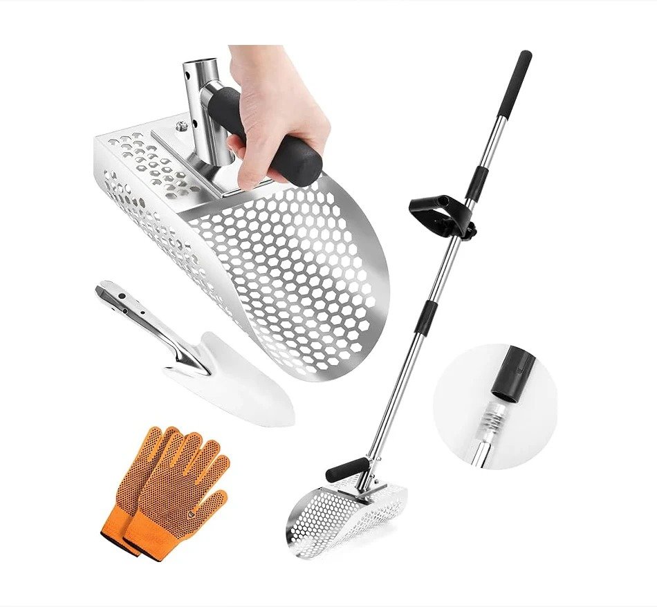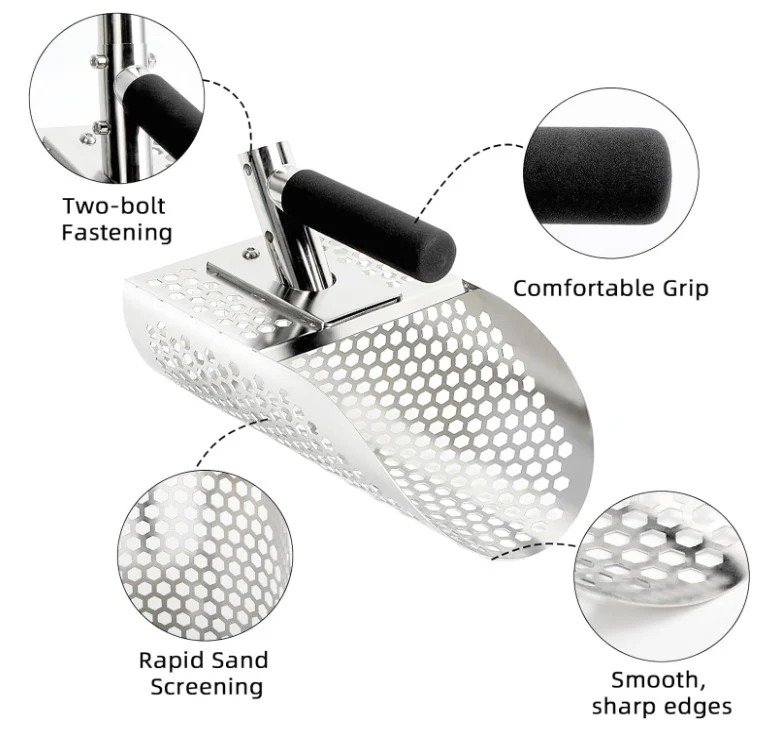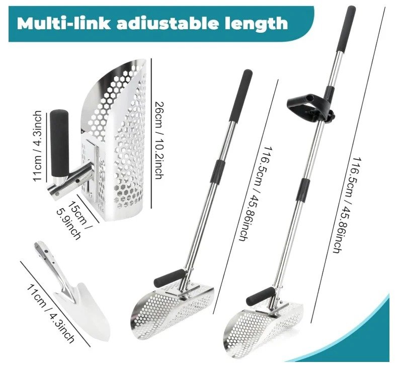 - 【Sand Shovel for Metal Detection】 This metal detector accessory kit includes a sturdy sand shovel, two connecting rods, and all necessary hardware, including screws. Made of high-quality stainless steel, this sand shovel has long-lasting corrosion resistance and is ideal for long beach adventures.