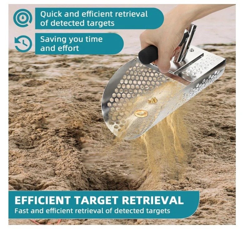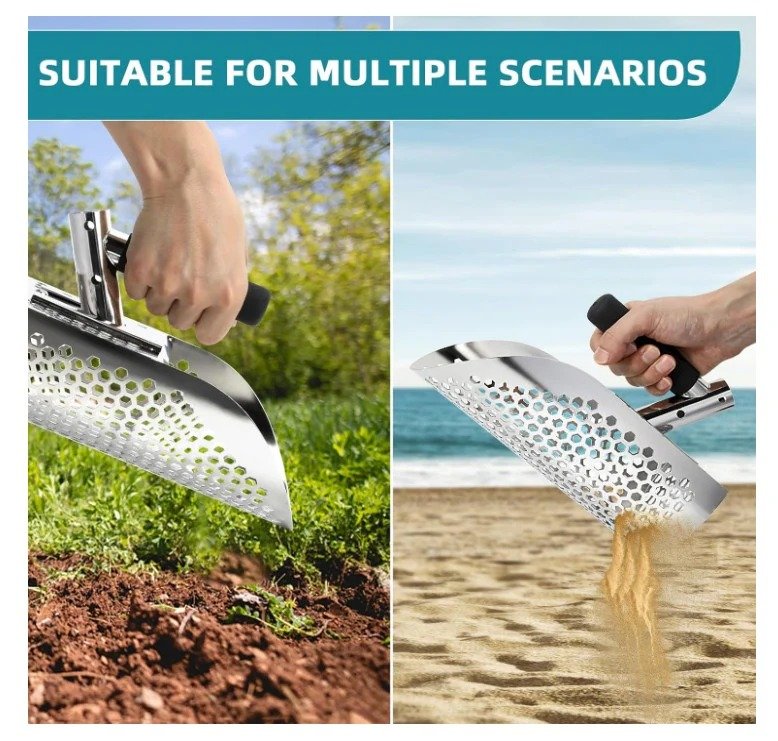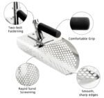 - 【Save Time and Energy】This tool is designed for scooping sand and sifting, and can easily identify and retrieve any metal objects. Once you find the treasure, simply scoop up the sand in the target area with the shovel and quickly shake it left and right. This will cause the sand to fall out of the hole, leaving only the sand you need.