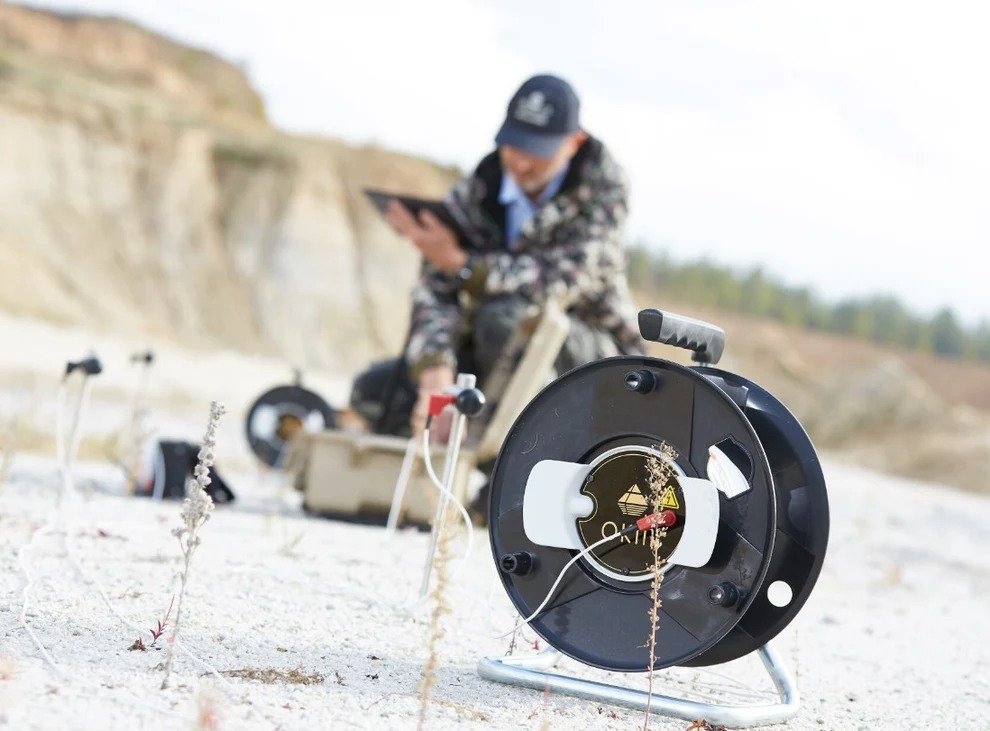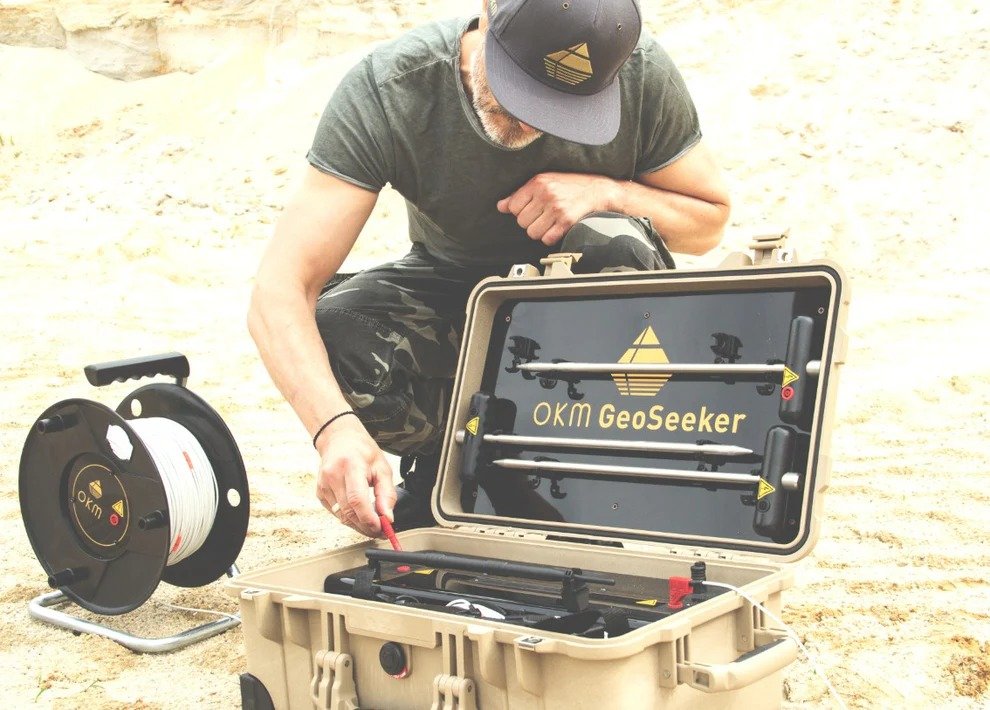 GeoSeeker utilizes a geoelectrical measurement procedure based on Schlumberger to read the apparent resistivity of the ground. Based on that ground resistivity the detector is capable to locate underground water deposits, water-bearing gravel and groundwater level as well as cavities like caves, tunnels, chambers and the like. Thus, the geophysical detector can be deployed as water finder or cavity detector at the same time.