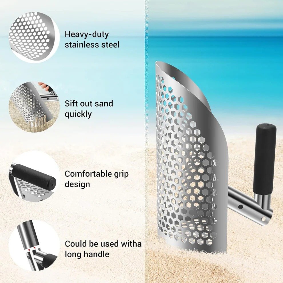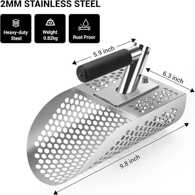 - EFFICIENT SAND SIFTER: Our sand scoop is a must-have to sift out sand quickly with high-density hexahedron 8.5 mm holes. This quick beach filter, adopting excellent workmanship, features a rubberized non-slip grip to perform easy operation during your beach combing and treasure hunting.